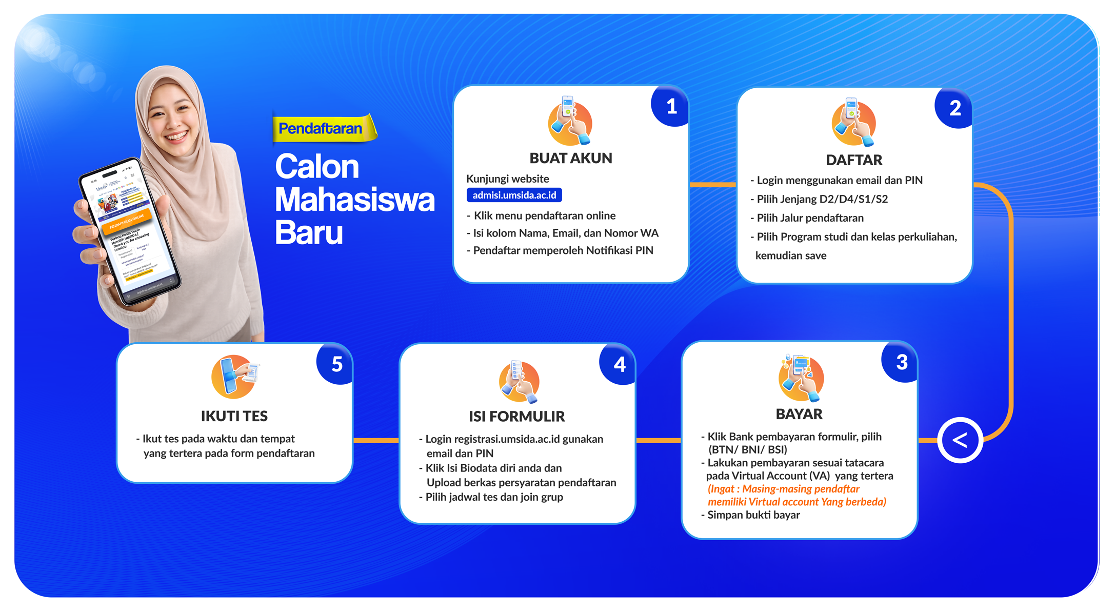 Calon mahasiswa baru yang telah melakukan pembuatan akun pendaftaran akan mendapatkan username, password serta Virtual Account (VA) Bank Syariah Indonesia (BSI) dan BNI